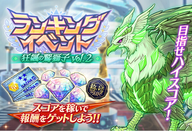 ランキングイベント「狂飆の鷲獅子 vol.2」開催! 制限時間内にボスに与えたダメージに応じてスコアが決定し、スコアに応じて様々な報酬を獲得して他のプレイヤーと競い合いましょう! 今回のボスは「風」属性となりますので、「炎」属性のパーティで挑んでみてください。