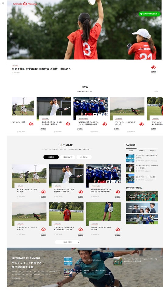 このたび、インター・ベルがリニューアルを担当したULTIMATE PLANNINGのWebサイトがオープン。アルティメットの選手たちのインタビューやルール・用語・大会などの競技情報に加えて、アスリートの方々に役立つ就職・転職情報なども掲載する、アスリートのための情報メディアに生まれ変わりました。