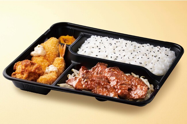 お肉をたくさん食べたい方のために肉ダブル盛りや、エビフライと唐揚げとミニ白身フライがセットになった「Dx牛ハラミ焼肉弁当」もご用意しております。