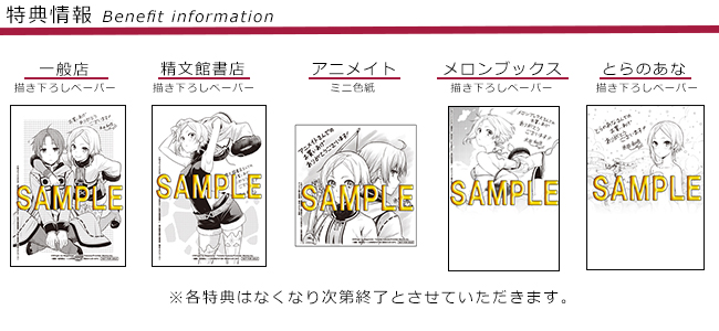 書店:アニメイト(ミニ色紙)、メロンブックス(描き下ろしペーパー)、とらのあな(描き下ろしペーパー)、