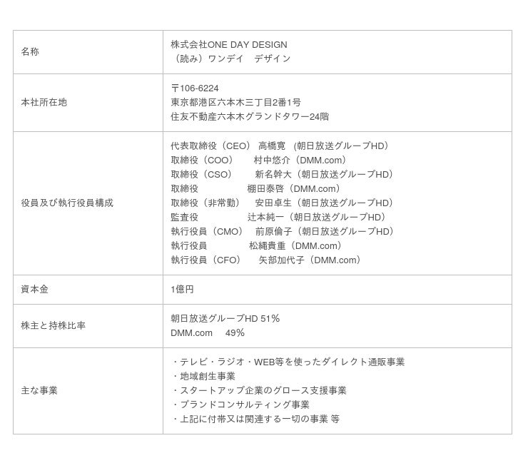 朝日放送グループホールディングス株式会社(本社:大阪市、代表取締役社長:沖中進、以下、朝日放送グループHD)と、合同会社DMM.com(本社:東京都港区、会長 兼 CEO:亀山敬司、以下、DMM)は、2021年1月18日を目途に合弁会社「株式会社ONE DAY DESIGN(ワンデイ・デザイン)」を設立します。