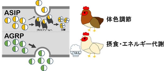 鳥類の体色や食欲を制御する“兄弟分子”ASIPとAGRPは、共通の祖先から生まれたにもかかわらず、まるで性格のように異なる分泌特性をもつことが分かりました。
