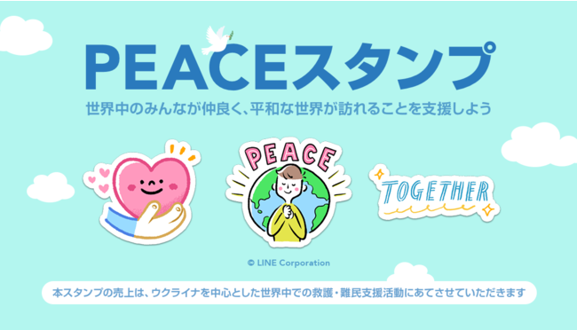 LINE株式会社(本社:東京都新宿区、代表取締役社長:出澤 剛)は、ウクライナを中心とした世界中で深刻な状況に置かれている子どもたちや難民の方々を支援するため、販売した売上全額(決済手数料を除く)を寄付するLINEドネーションスタンプ『PEACEスタンプ』を3月22日(火)より販売開始しましたので、お知らせいたします。