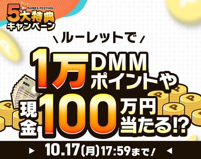 10月17日(月)17:59まで毎日DMMポイントがもらえるスタンプカードや現金100万円が当たるドリームルーレット、さらに10連ガチャチケットなどゲーム内アイテムが必ずもらえるキャンペーンなど内容盛りだくさんの「秋のDMM GAMES FESTIVAL」が開催中です。ぜひこの機会にDMM GAMESのタイトルをプレイしてください!