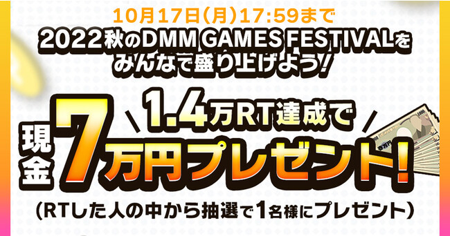 合同会社EXNOA(本社:東京都港区、CEO:村中 悠介、URL:https://games.dmm.com/)が運営するDMM GAMESは、1.4万RT達成で現金70,000円が抽選で1名様に当たる「秋のDMM GAMES FESTIVALを盛り上げよう!」RTキャンペーンを開催中です。