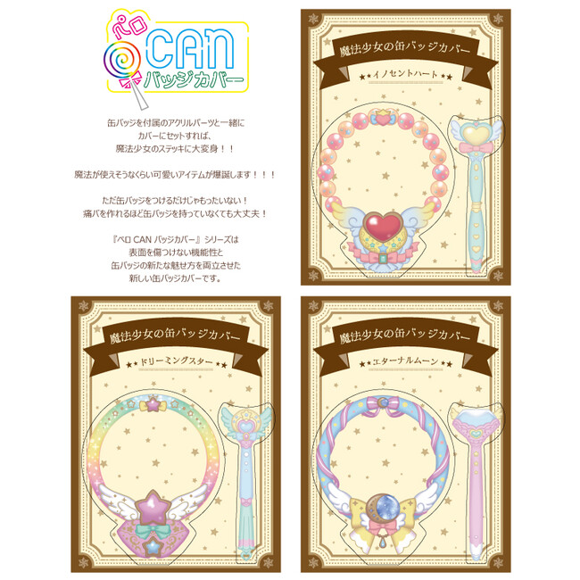 ・魔法少女の缶バッジカバー(イノセントハート/ドリーミングスター/エターナルムーン) 各605円(税込)
