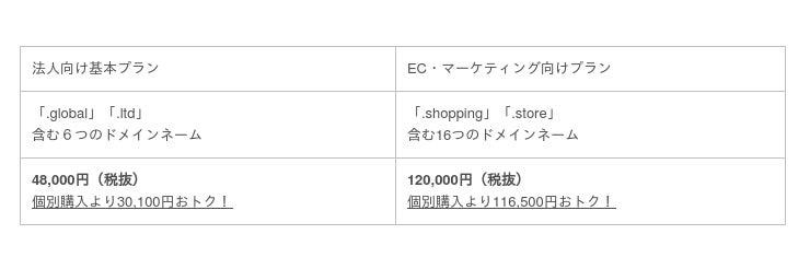 法人に関連する新gTLDをパッケージ化したプランです。「.global」「.ltd」をはじめとする、6個のド