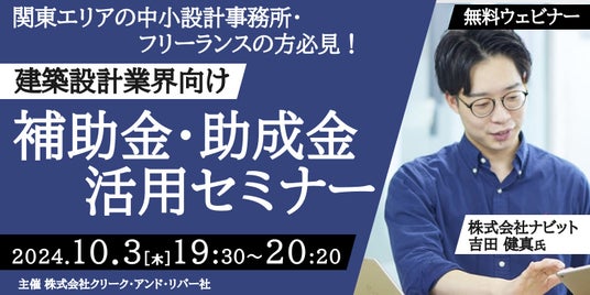 株式会社クリーク・アンド・リバー社(C&R社)は10月3日(木)、関東エリアの中小設計事務所やフリーランスの方を対象に、無料のオンラインセミナー「建築設計業界向け補助金・助成金活用セミナー」を開催します。
