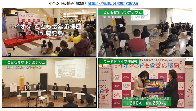 2023年1月21日、22日にイオンモール鹿児島で、お客さまと、地域で活動している団体や企業、学校、自治体の皆さま方をつなぎ、こども食堂の活動を地域全体で応援する体験型イベント「鹿児島 こども食堂応援団!」を開催しました。情報発信、意見交換、フードドライブなどを実施し、お客さまがこども食堂の支援に直接参加できる機会を提供しました。今後、同様の取り組みを全国でも順次展開していく計画です。