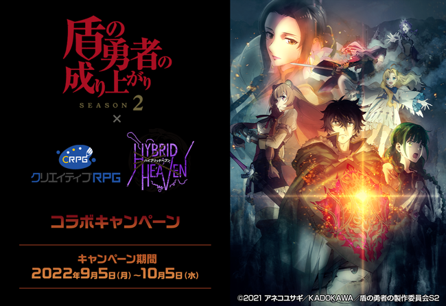 株式会社フロンティアワークス(アニメイトグループ)では、TVアニメ「盾の勇者の成り上がり Season 2」と、ブラウザゲーム「クリエイティブRPG」並びに「WTRPG12ハイブリッドヘブン」にて期間限定コラボキャンペーンを同時開催中。