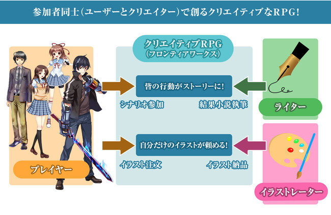 オリジナルキャラクターの【小説】や【イラスト】をクリエイターたちと一緒に作っていく、TRPG(テーブルトークロールプレイングゲーム)のような手作り風RPGです。