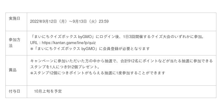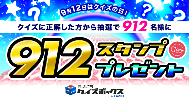 キャンペーンは2022年9月12日(月)・13日(火)に、「まいにちクイズボックス byGMO」をはじめとする提携23媒体で実施、毎日3回開催するクイズ大会のいずれかに参加いただくことで23媒体で合計912名に、各媒体にて使えるポイントなどが当たる抽選に参加できるスタンプを、1人につき912個プレゼントするオトクなキャンペーンです。