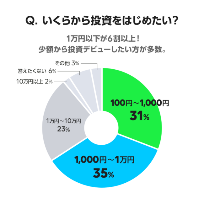 投資をはじめたい金額に関しては、「100円~1,000円」が31%、「1,000円~1万円」が35%、と「1万円以下」から投資をはじめたい方が66%となり、少額から投資を希望する方が多い結果となりました。