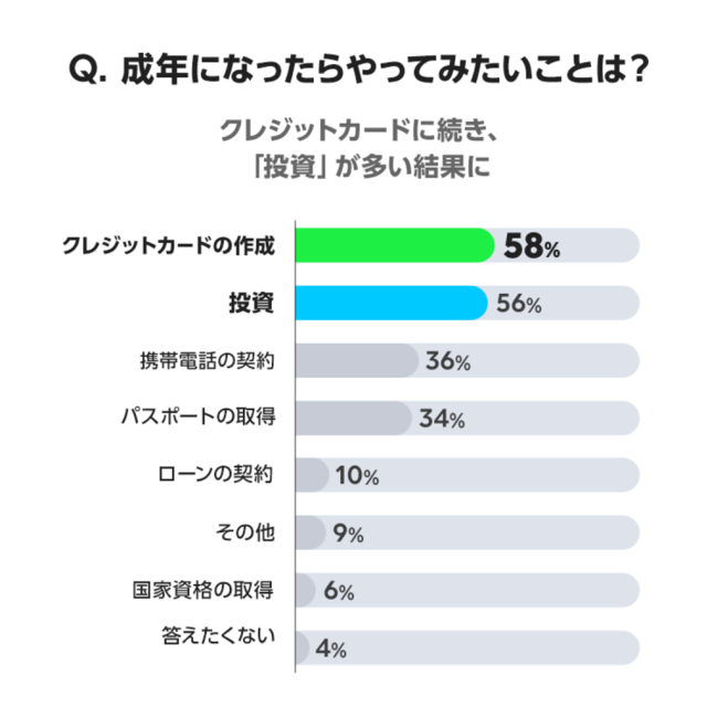 成年になったらやってみたいことは、クレジットカードに続き、「投資」が多い結果に