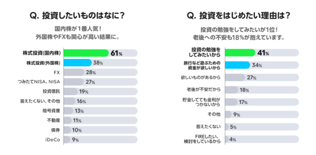 投資したいものや活用したい制度等に関しては、「株式投資(国内株)」が61%ともっとも多く、続いて「株式投資(外国株)」が38%、「FX」が28%と株式投資への関心が高いことがわかりました。投資をしてみたい理由については、「投資の勉強をしてみたいから」が41%、「旅行など遊ぶための資金が欲しいから」が34%、「欲しいものがあるから」が27%、「老後が不安だから」が18%という結果になりました。