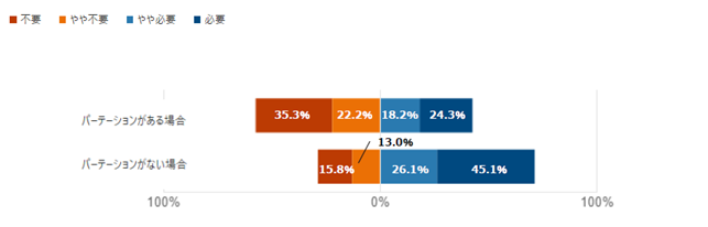 アンケートでは、執務室内でのマスク着用の要否について、執務室内にパーテーションがある場合とない場合の2パターンを想定し質問を行いました。結果、パーテーションがある場合「マスク着用が不要」と回答した人の割合は約6割に上り、一方でパーテーションがない場合は「不要」は約3割にとどまりました。