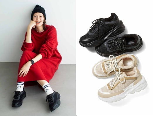 ルックスとは裏腹に驚くほど軽い履き心地です。冬コーデをバランスよく整える、ボリューム感ある裏ボア仕様。甲高幅広さんもうれしいゆったりフォルム。コーデしやすいワントーンですがのっぺり見えないのは、スムース調・スエード調・メッシュなどの異素材を組み合わせているから。やや厚底なので、スタイルアップもかなえます。〈ベージュ〉〈ブラック〉から選べます。