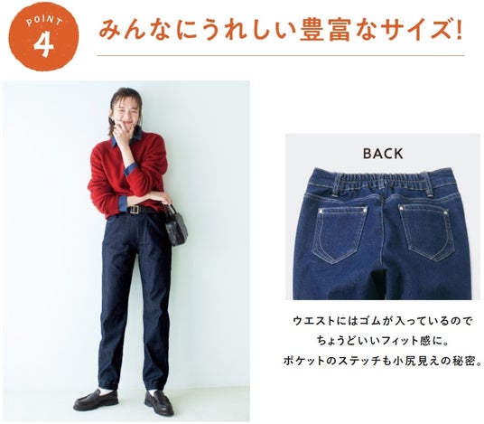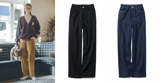 少し太め幅にリニューアル!ヒップやおなか・太ももまわりをカバーしながら、すそからすきま風が入りにくい”ちょうどいいワイド感”はキープ。腰からすとんと落ちて、すっきり決まります。〈ベージュ〉〈ブラック〉〈デニム〉の3カラー展開です。