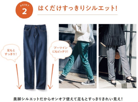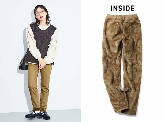 2009年発売以来、シリーズ累計販売数72万本を突破した「裏ボアパンツ」は、ぬくぬくのボアを裏全面にボンディング。表地とボアの間に防風コーティングをほどこすことで風を通しにくく、毛布に包まれているようなあたたかさを実現しています。また、すそに向かって少し細くなるシルエットで、美脚見せがかないます。裏がボアと感じさせないデザインで、寒さを我慢せずに着こなしを楽しむことができます。ググッと伸びやかなストレッチ素材で、通勤・通学やお出かけにぴったりです。