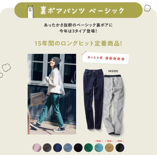 ◆新カラーが加わった「裏ボアパンツ」のベーシックタイプ