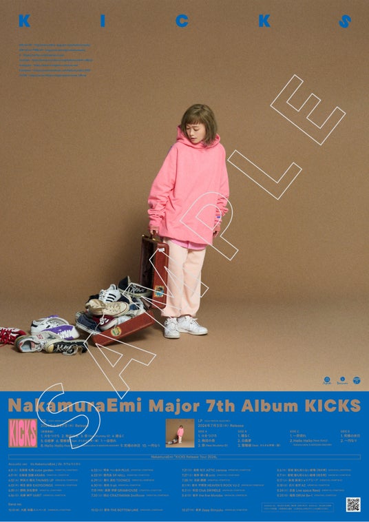 データをダウンロードしてプリントし、ハッシュタグ #NakamuraEmiKICKS と、NakamuraEmiのオフィシャルアカウントをタグ付けして、ポスターを貼った写真を自身のXもしくはInstagram(フィード・ストーリー・リール)に投稿してくれた方の中から5名に直筆サイン入りB2ポスターがプレゼントされるので、こちらも是非奮って参加してほしい。