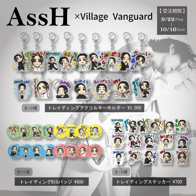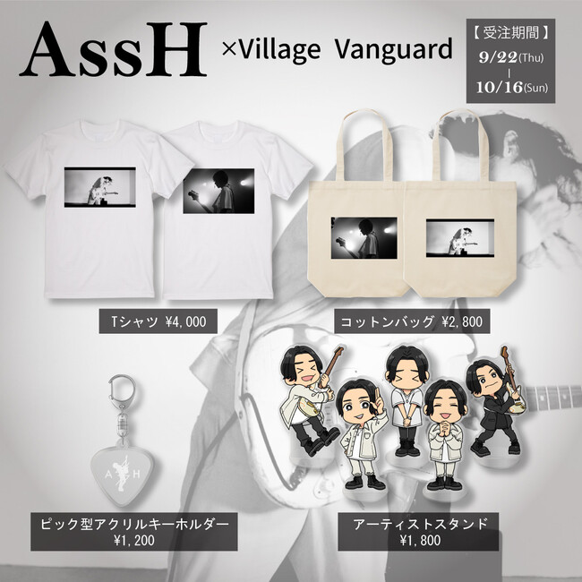 YOASOBI・AI・渡辺美里・倖田來未・EXILE・Hey!Say!JUMP・鶯籠・iamSHUM・Cyber Japan Dancersなど様々なアーティストのサポートを務める、日本イチと言っても過言ではない『AssH』さんとのコラボグッズが登場です!見どころは拘りの実写素材を使用したTシャツとトートバッグと、LINEスタンプでお馴染みのAssHさんのイラスト素材!実はアクリルスタンドに使用したイラストは、今回のために描き下ろしても頂いたんですよ!