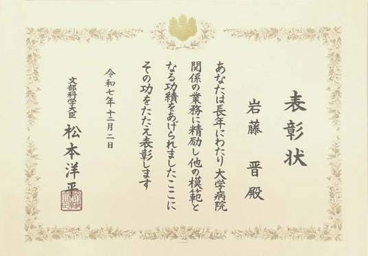 医学教育等関係業務功労者表彰状(岩藤臨床工学技士)