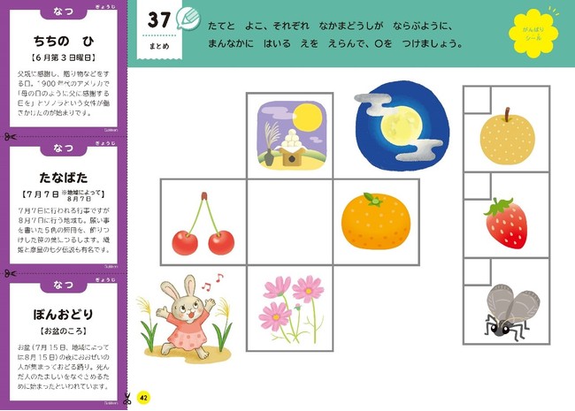 「きせつワーク」では、カラフルなかわいいイラストで、系統立てて季節にまつわる知識を学ぶことができます。