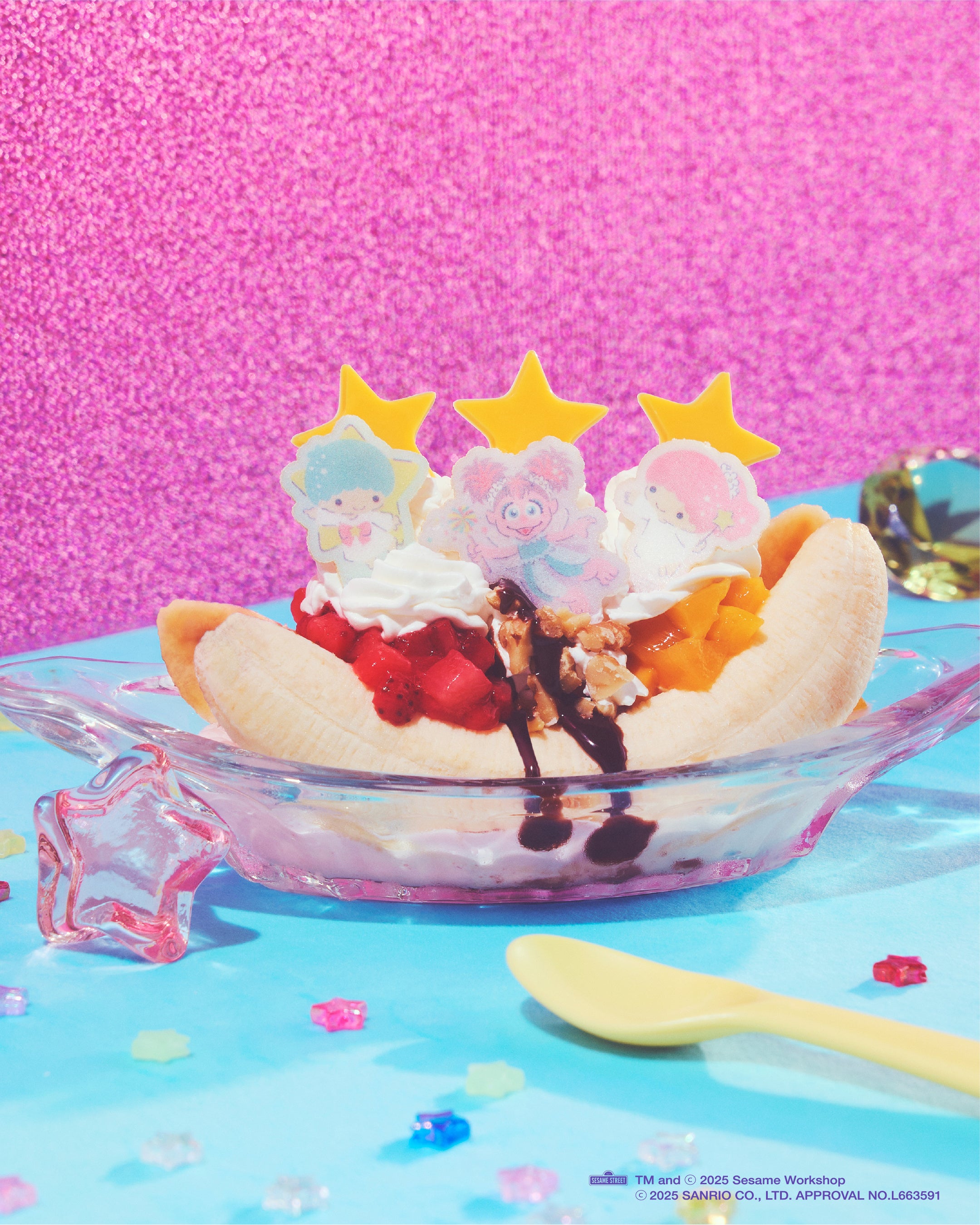 バナナをまるごと一本使用し、ストロベリーやマンゴーの果肉を贅沢にトッピング。仕上げにアビー、キキ、ララのモナカをのせ、まるで雲の上で3人が仲良く遊んでいるかのような、見た目にも楽しい一皿に仕上げました。