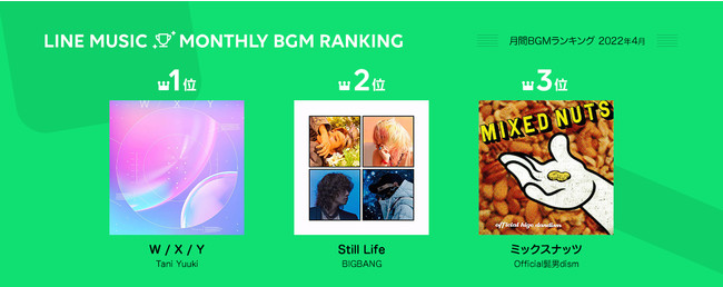 そのほか、今期の人気アニメ『SPY×FAMILY』のOP曲となったOfficial髭男dism「ミックスナッツ」が6位、ED曲の星野 源「喜劇」が9位にランクインしたほか、 4月1日にLINE MUSICでもサブスク解禁されたMy Hair is Badの楽曲がTOP100に複数ランクインする結果となりました。