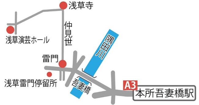出口A3から出て直進、墨田区役所入口吾妻橋東詰の信号を通り直進します。