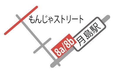 出口6から大手門口 徒歩約7分、出口10から中の御門口 徒歩約5分→月島駅から「もんじゃストリート」
