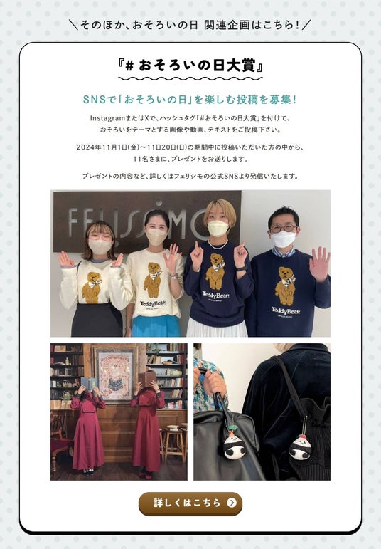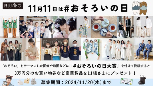フェリシモは、11月11日の記念日「おそろいの日」に合わせ、「#おそろいの日大賞」を開催しました。ハッシュタグ「#おそろいの日大賞」を付けた“おそろい”をテーマとする写真やイラストなどの画像、動画、テキストのInstagramとX(旧Twitter)の投稿が対象で、11月1日~11月20日の募集期間に投稿された中から賞を発表します。大賞には3万円分のお買い物券、おそろいが楽しめるフェリシモのアイテムをペア(2点セット)で、そのほか合計11組の受賞者へ各賞を贈ります。親子や兄弟・姉妹、友だち、パートナーとのコミュニケーションを広げ、一緒に“おそろい”を楽しむ文化を創ることで、世界がもっとHAPPYになってほしいとの想いを込めた記念日イベントです。