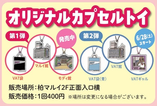 加えて、ご好評いただいているオリジナル・カプセルトイ「思い出アクリルキーホルダー」は、現在第2弾として、かつての「柏VAT」をモチーフにした3種のアクリルキーホルダーを販売中(1回400円)です。