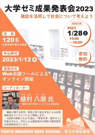 東京マガジンバンクカレッジ「大学ゼミ成果発表会2023~雑誌を活用して社会について考えよう~」をオンラインにより開催します!