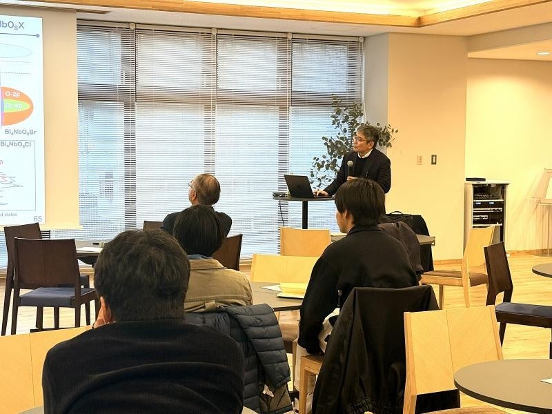 ミーティングは、世話人を務める学術研究院先鋭研究領域(異分野基礎)の三澤弘明特任教授による開会あいさつで始まりました。続いて、京都大学大学院工学研究科物質エネルギー化学専攻触媒機能化学分野の阿部竜教授が、「人工光合成実現に向けたZスキーム型可視光水分解系の開発」と題して講演しました。