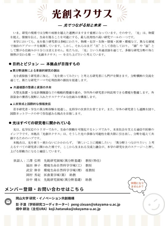 「光創ネクサス」は、光を扱う研究者だけでなく、「新しいことに挑戦したい」、「異分野とつながりたい」と考えるすべての研究者に開かれた交流拠点として、発展していくことを目指します。引き続き、地域中核・特色ある研究大学:岡山大学の取組にご期待ください。