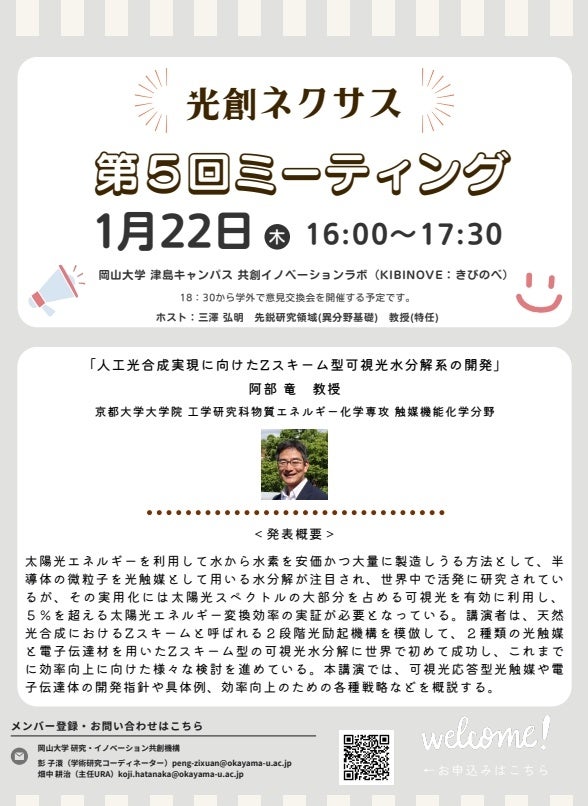 国立大学法人岡山大学(本部:岡山市北区、学長:那須保友)は2026年1月22日、本学津島キャンパスの共創イノベーションラボ(KIBINOVE、きびのべ)において、第4回に続き「光創ネクサス」第5回ミーティングを開催しました。「光創ネクサス」は、「光」を研究手段として活用する多様な分野の研究者が連携し、新たな研究テーマの創出や応用展開につなげることを目的とした研究拠点です。