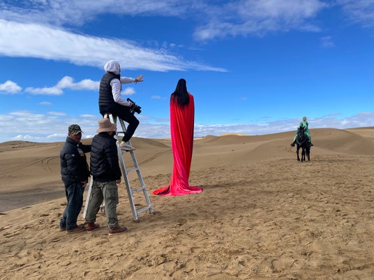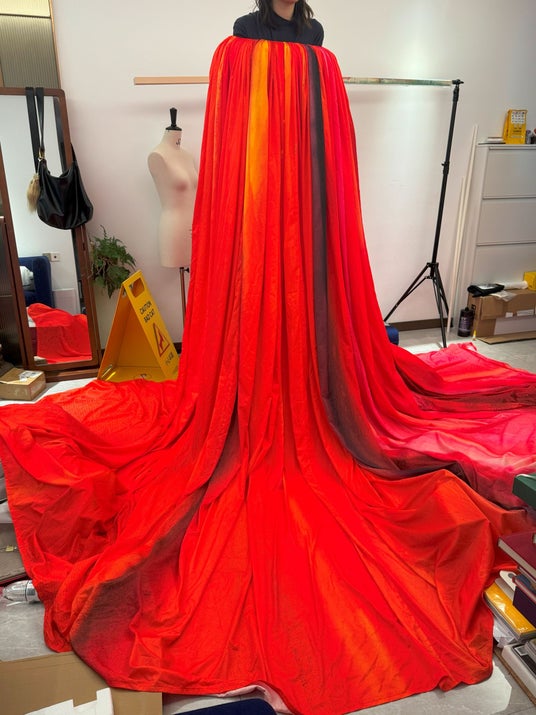 レザーの案も出ていましたが、夏のイメージを強くするため、より軽い生地でのデザインになっています。砂漠の中に「大地の母」を2メートル以上高めたいとの希望があり、2メートルを超える「大地の母」がすっぽり隠れる大きな赤いマントを制作。結果、赤いマントの優美な存在感が砂漠の景色とのコントラストを生み出し、超越的な大地の母像のイメージへ大きく貢献しました。