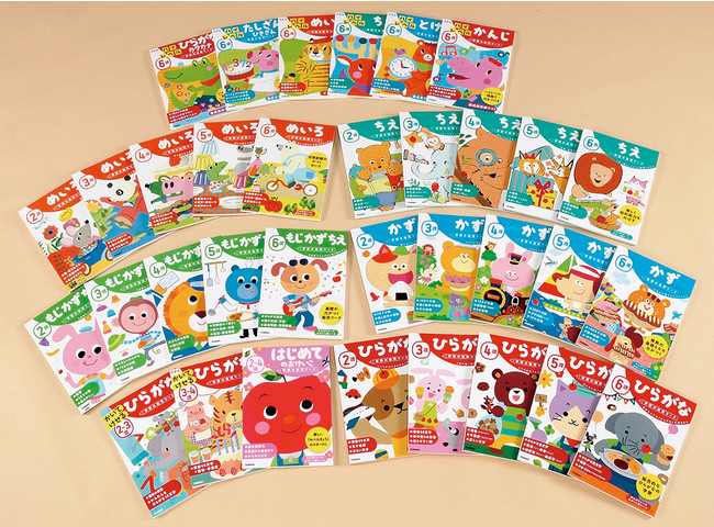 2~6歳向けの年齢別おべんきょうワークブック。「ひらがな」「かず」「めいろ」など全部で50点以上。全国の書店、ネット書店で販売中。