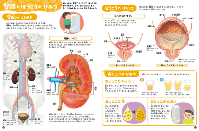 しかけをめくると、からだの中が見られます。例えば、口に入った食べものが、どこを通って、どんなことが起き、どのように変化していくのか、しかけを順番にめくることで、うんちができるまでがわかります。そのほか、骨と筋肉、歯、目耳鼻口、血管と心臓、おしっこができるまで、脳、風邪をひいてなおるまで、など。いろいろな器官のしくみが楽しく学べて、子どものいちばん身近なギモンである「からだ」のなぜ・どうしてが解決します!