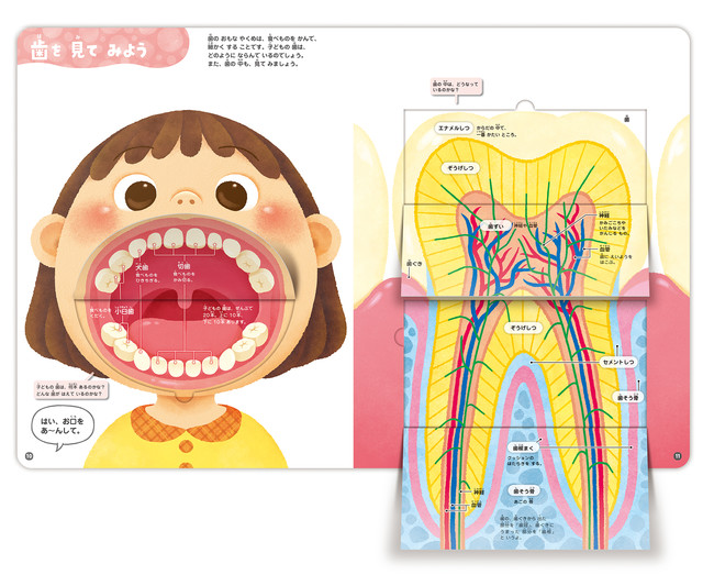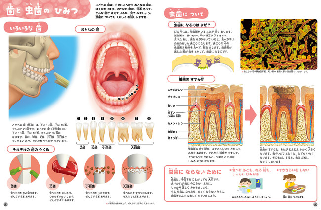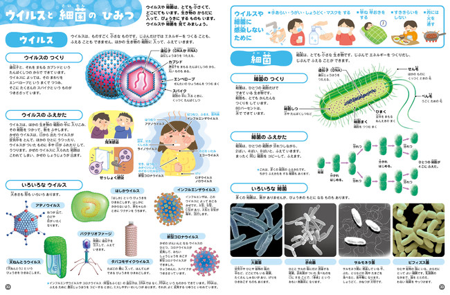 しかけページのあとに、その器官をくわしく解説する図鑑ページがあるので、さらに理解が深まります。図鑑ページには、3D人体イラストや電子顕微鏡写真が満載。いろいろな器官の構造やはたらきについて、ていねいにわかりやすく解説しています。新型コロナウイルスについての説明もあり、「ウイルスや細菌に感染しないために」、「虫歯にならないために」なども紹介。