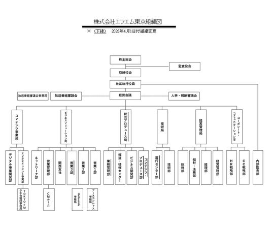 株式会社エフエム東京(本社:千代田区麹町 代表取締役社長執行役員:唐島夏生)は、2026年4月1日付にて、下記のとおり組織変更および人事異動を決定いたしましたので、お知らせいたします。