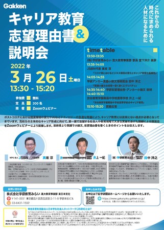 株式会社学研ホールディングス(東京・品川/代表取締役社長:宮原博昭)のグループ会社、株式会社学研教育みらい(東京・品川/代表取締役社長:小林徹)は、2022年3月26日(土)に、高等学校の教員向けのオンラインイベント「キャリア教育&志望理由書説明会」を開催します。