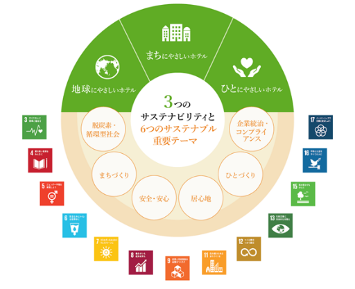 私たちは、サステナブル方針として“地球にやさしいホテル・まちにやさしいホテル・ひとにやさしいホテル”という3つのサステナビリティ(目指す姿)と6つのサステナブル重要テーマ(社会課題の中から重点的に取り組んでいくテーマ)を定め、SDGs(持続可能な開発目標)の観点を深く認識しながら、ホテル事業を通じて「持続可能な社会」の実現に貢献してまいります。