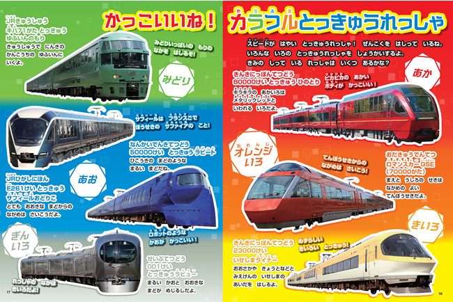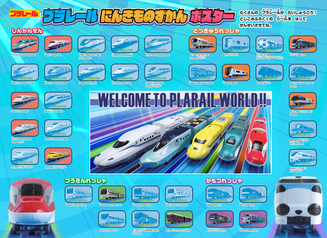 新幹線、特急、通勤列車、貨物列車など、シールを貼って図鑑を完成させるお楽しみポスターです。
