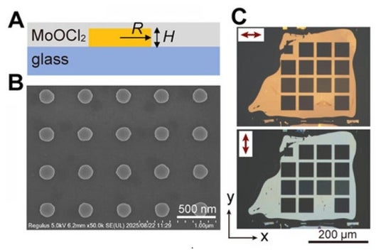 右図A:シリカガラス基板上のMoOCl2のナノ構造の模式図、B:代表的なMoOCl2の円形ナノ構造の電子顕微鏡写真(半径:87 ナノメーター(nm)、高さ:50 nm、構造間距離:500 nm)、C:反射顕微鏡で測定した構造全体の光学イメージ。上図はMoOCl2の金属的性質を持つ方向の直線偏光を照射、下図は絶縁体的性質を持つ方向の直線偏光を照射。