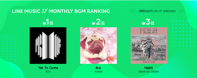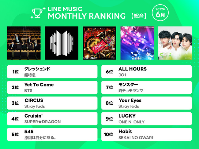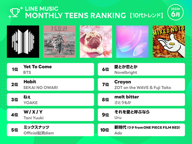 ングサービス「LINE MUSIC」( https://music.line.me/ )の2022年6月の月間ランキングを発表、人気楽曲