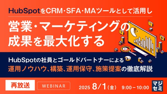 マジセミ株式会社は「【再放送】HubSpotをCRM・SFA・MAツールとして活用し営業・マーケティングの成果を最大化する」というテーマのウェビナーを開催します。