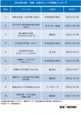 <2022年10月 書泉・女性タレント写真集売上ランキング>